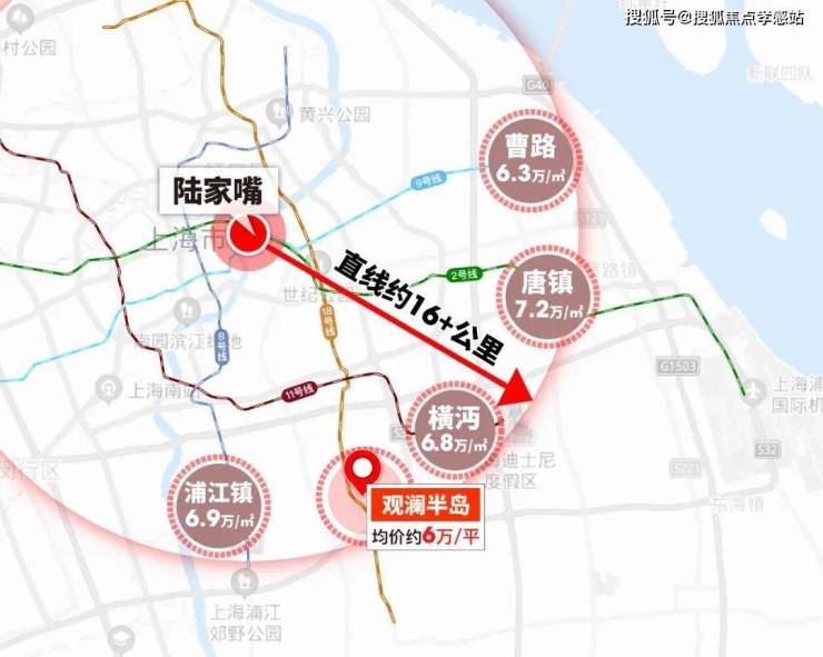 先看以陆家嘴为圆心,半径16+公里沿线通地铁板块的房价格局,唐镇、橫沔、浦江镇百平米3房总价都在700万左右,配套能级相对落户的曹路联动价也要6.3万/㎡。