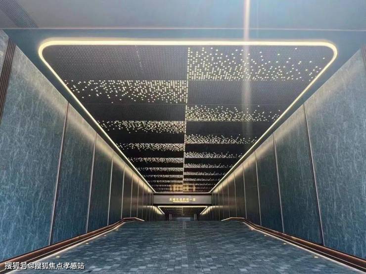 大华·星曜售楼处电话:400-8080-420☎☎√√星空连廊的顶面采用香槟金铝板、墙面为爱马仕灰仿石砖,并镶嵌金属线条、就连地面都采用了夜里雪仿石砖。