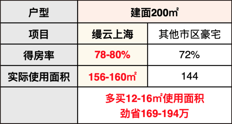 同样面积段的产品,超高的得房率让缦云上海三期比其他市区豪宅多了14-16㎡的实际使用面积。