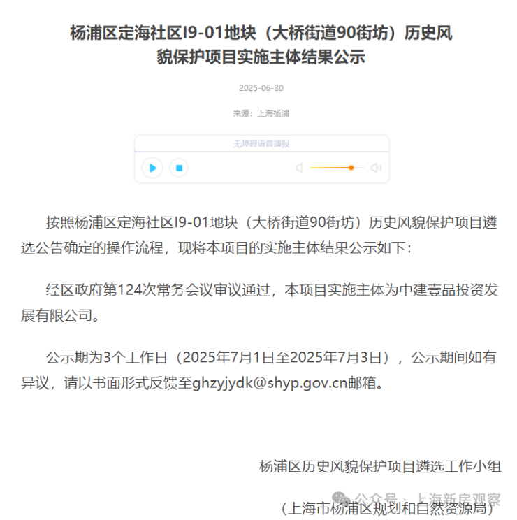 日前,杨浦定海社区I9-01地块(大桥街道90街坊)历史风貌保护项目遴选结果公示:中建壹品投资发展有限公司成功拿下杨浦大桥街道90街坊地块。