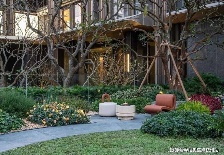 而在3、5号楼之间,则搭建了【围炉夜话】场景空间。古木纹奢石砌成的火炉旁,整木炭化石凳散发着山林野趣,一株红舞姬枫树翩然伴舞。冬日傍晚,好友围坐,体会名门温情。