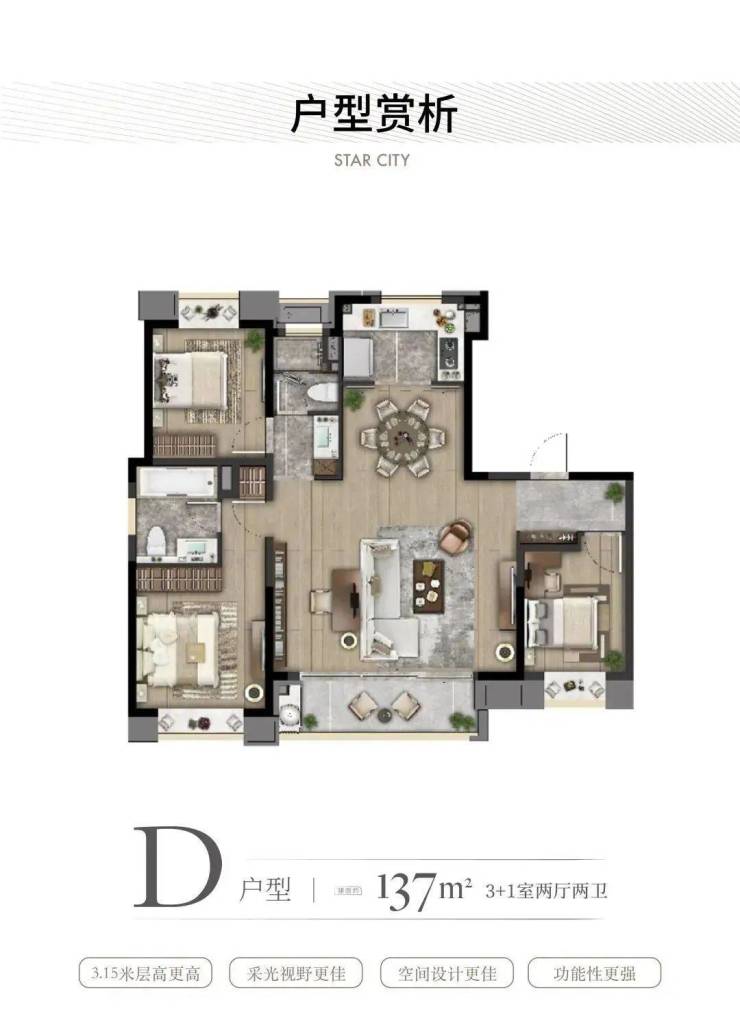 约137㎡户型:格局上做到了三开间朝南+南北通透,大尺度的奢阔横厅设计串联南向观景大阳台,整个公区的视野无比通透;主卧套房,保证了业主的尊崇感和私密性!
