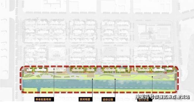 一界面是滨水景观界面(项目红线外),依托南侧的天然水系及滨水公园,打造慢行景观系统,并将滨河栈道、运动公园、骑行等多种功能嵌入,提升舒适度的同时,也为居民提供放松身心的好去处。