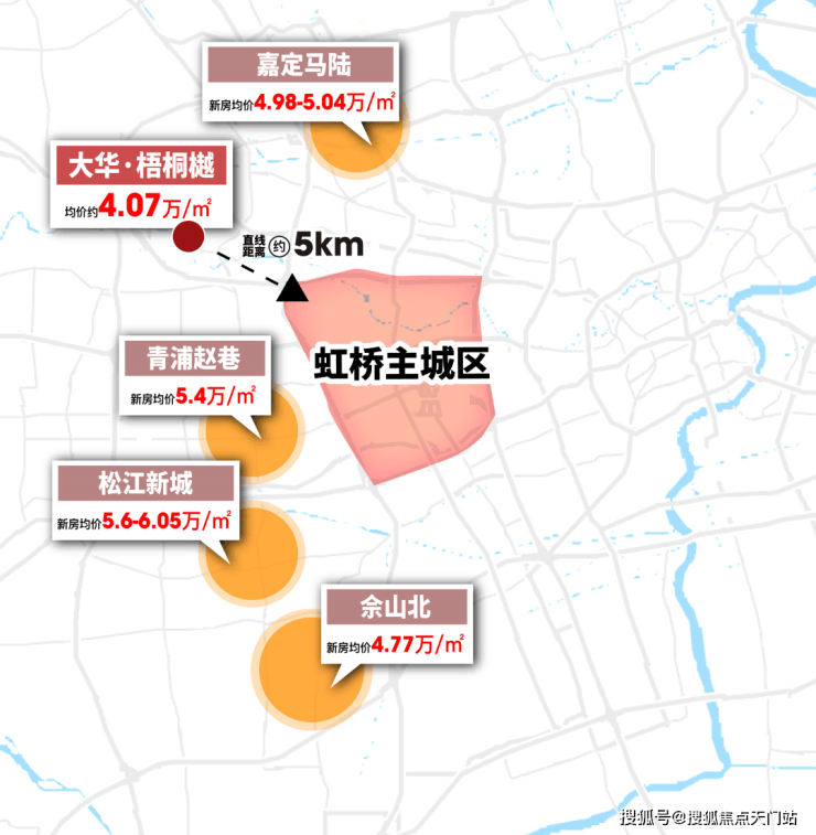 通过百度地图测距我们发现:安亭距离虹桥主城区直线距离仅约5公里,但总价仅约300万级!