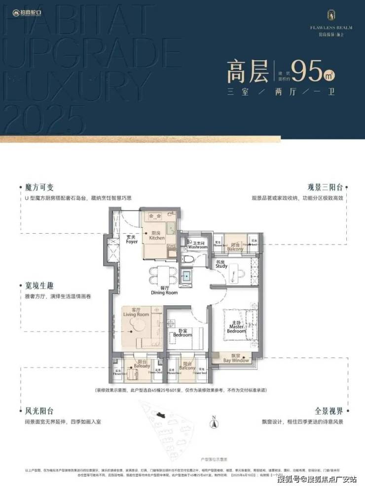 再加上南向大面宽短进深、全卧飘窗、L型转角阳台设计,哪怕小户型95㎡3房,尺度感都超棒,采光和视野更是一流。