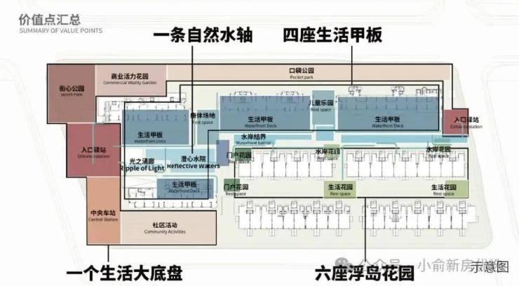 以自然水系为界,生长为独立的城市岛屿,通过六大景观节点,浮水之门、光之通廊、澄心水院、岸野森活、溪语花境、林语归岸,具象生活本应如流水般自在从容。