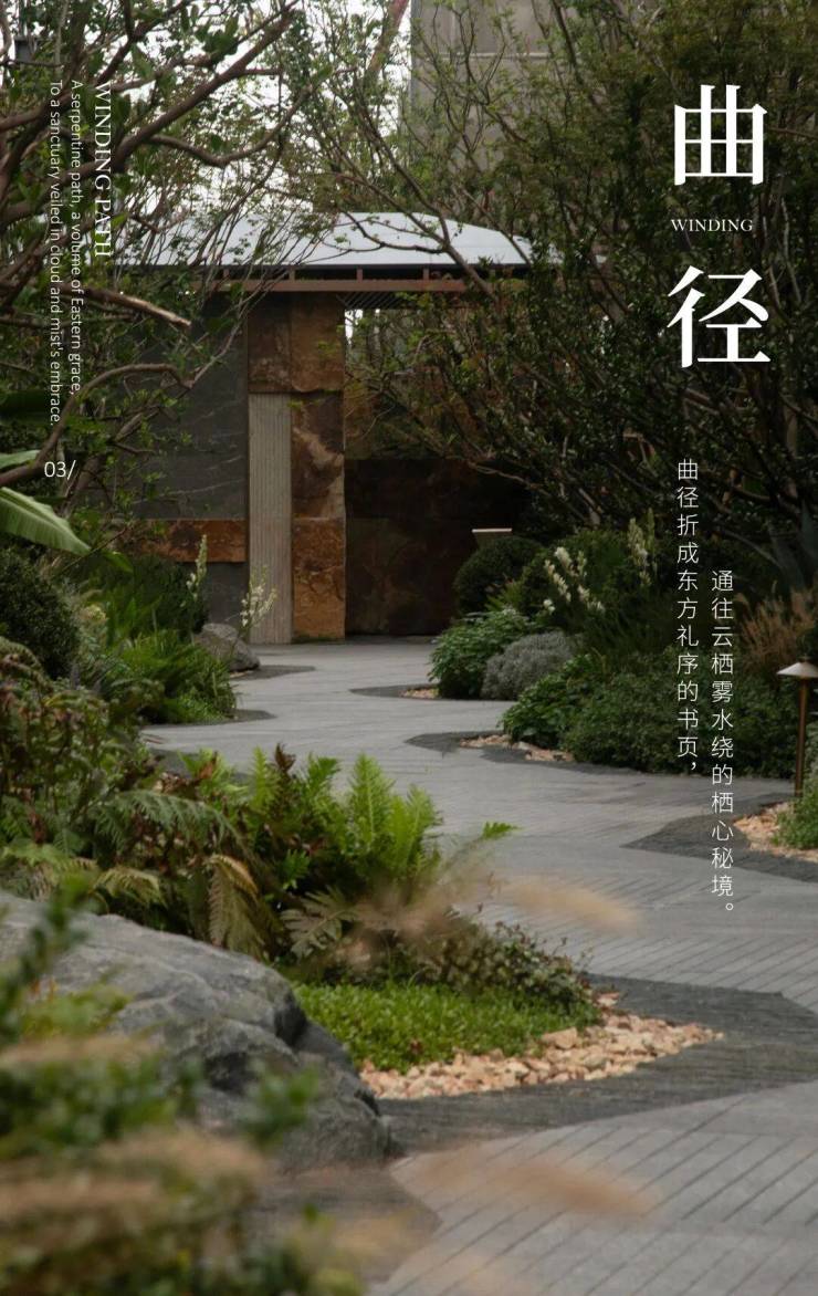 “曲径”不仅是行走的路径,更是一场温柔的心境流动。全冠乔木、珍稀灌木构成空间的骨架,观赏草与宿根花卉交织出四季的色谱,使归家如同穿行于一座植物博物馆,身心皆被治愈。