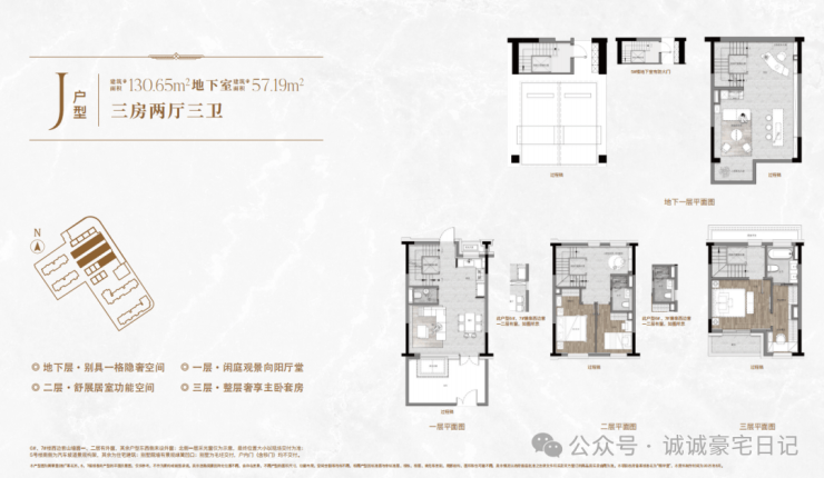 一楼和地下室主社交和志趣,二楼是子女的房间,三楼是主人休憩区。