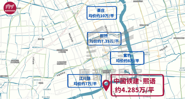 南上海沿线,莘庄均价约10万/平;颛桥约7.35万/平;紫竹约8万/平,与「中国铁建·熙语」一江之隔的江川路地铁站,均价也高达7万/平。