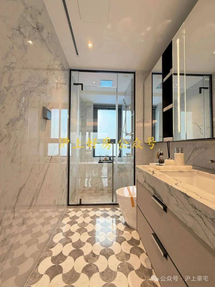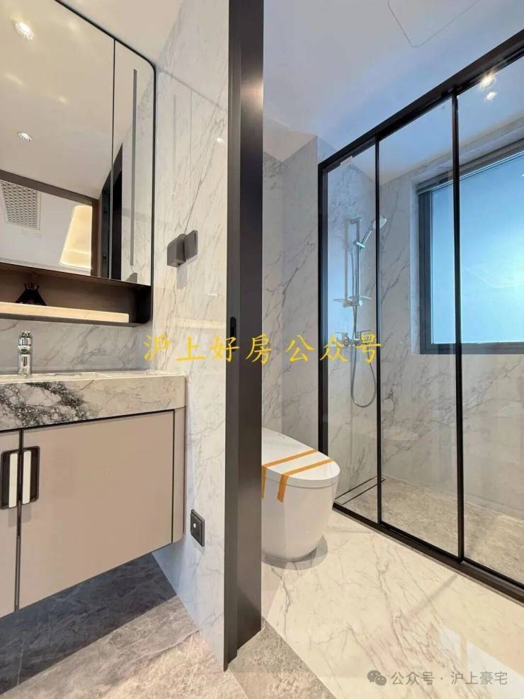 奢石台面,皮革饰面柜抽屉,侧端设置金属收纳开放格;定制镜柜,中间的透光玉石直接提升了高级感,镜柜内部配备了美妆冰箱+美妆灯条+轨道收纳!