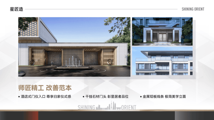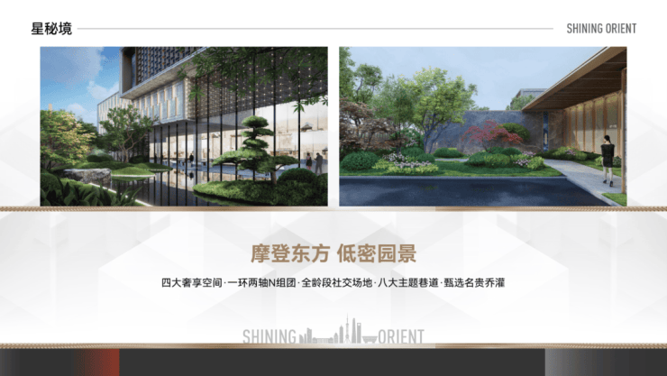 项目整体以摩登东方为核心造景理念,营造一环两轴N组团的景观布局,将花草、树木、流水、山石、景墙编织成序曲语言,在浮躁与喧嚣的城市中,用宁静温润的语言将摩登东方的惬意美好娓娓道来。