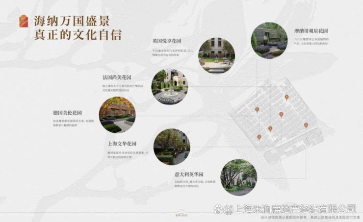 摩纳哥观星花园的地中海风情,英国悦享花园的文艺草坪,上海文华花园的海派诗篇,法国尚美花园的艺术交响,意大利英华园的现代叙事,德国美伦花园的理性协奏。