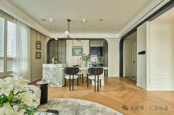 电梯厅以法式宫廷风流线型化设计,潮流艺术、流畅大气,空间更显通透,明亮、优雅、高贵的氛围扑面而来。两边拱形门洞和立柱,不仅增加了尊贵的仪式感,也提升了空间转换的联动性。