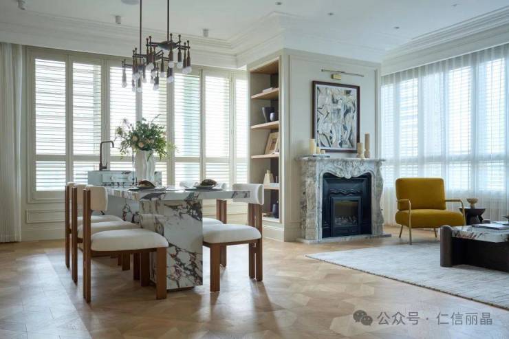 入门的玄关景墙与地面的石材拼花形成呼应,装饰的手绘艺术画呈现宁静优雅的氛围。主人在离家前可在此等候司机,或在归家时在此更衣。配上本白的护壁板和圆弧的门框,以及高大落地窗,房间里充满了一种“空气感”。