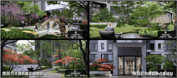 多花园:沿归家轴线设计了悠闲童梦花园·、静谧私语花园、精致乐享花园、邻里会客花园、活力健身花园等。花园种植了像金桂、红梅、晚樱、榔榆等植被,常绿与落叶植物组合搭配,三季有花,四季有景。