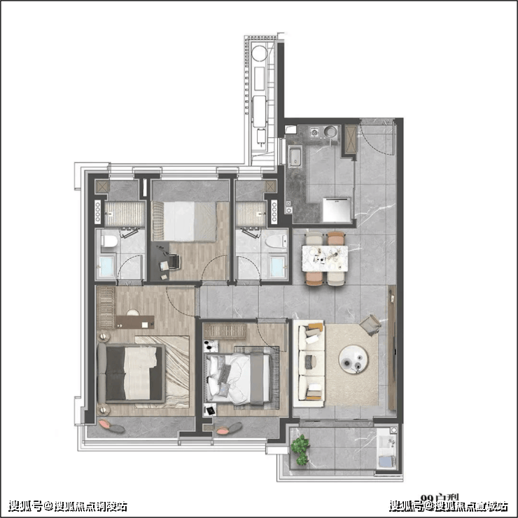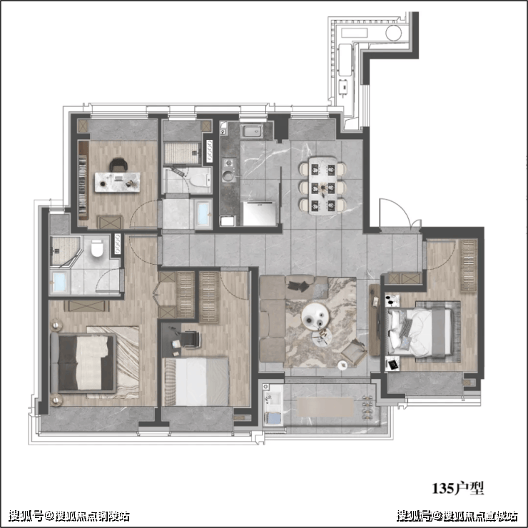 该户型贴合当代人居生活习惯,既适合三口之家小太阳家庭,也可以是三代同堂,每个人都能拥有独立空间。