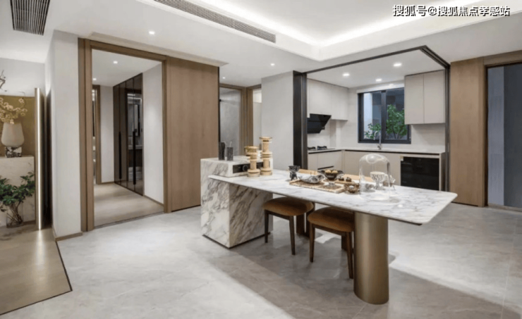 厨房设计为社交餐厨,【金地嘉峯汇】售楼处电话✆:400-8855-420✆其中移门采用金属移门+瓦楞玻璃,可根据需求自行开合,不仅引入更多光线,更增强了互动性!操作台面边框收窄,设计更加精细美观,同时配备方太(或同等品牌,以实际交付为准)油烟机和灶台、洗碗机,以及名族凉霸,可谓是细节满满!
