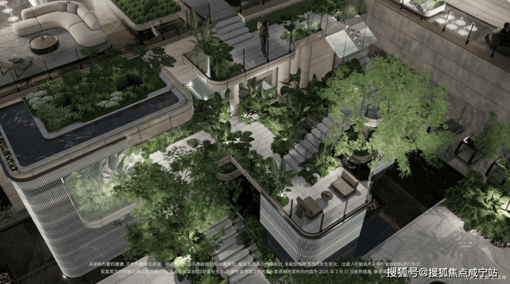 下沉式庭院,通过垂直景墙、悬浮观景台与叠水景观的立体交织,实现移步换景的视觉效果,也与会所空间形成无界交互。