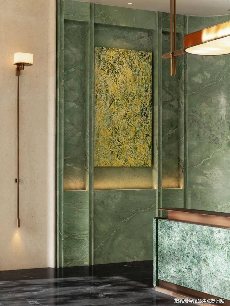 项目公区大量采用各种昂贵石材,以高端酒店的标准定制与打造。比如主入口大堂,是带有青绿色纹理,名为只此青绿的奢石,地面用的是太古黑金奢石,高奢的调性一下子显现出来。