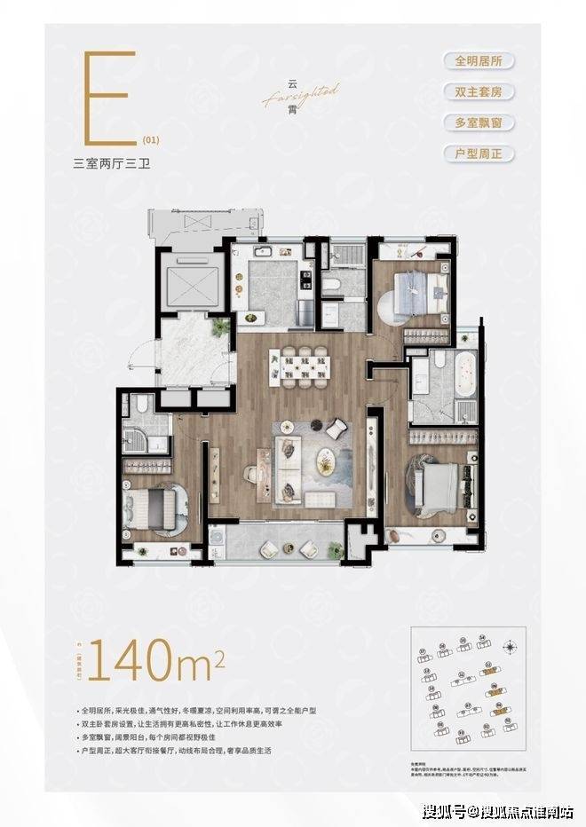 建面约140㎡3房3卫户型,三开间朝南+大横厅的设计,整个南向采光面相当宽绰。