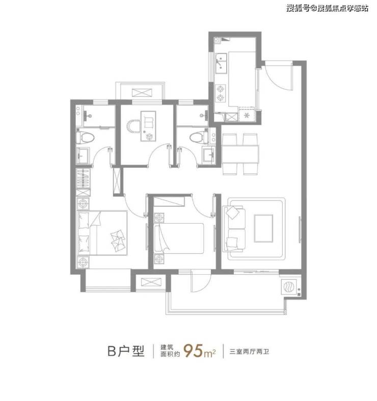 建面约95㎡的3房2厅2卫户型,可以说是刚需置业一步到位的户型,从二人世界到二胎家庭的全生命周期需求都能满足。
