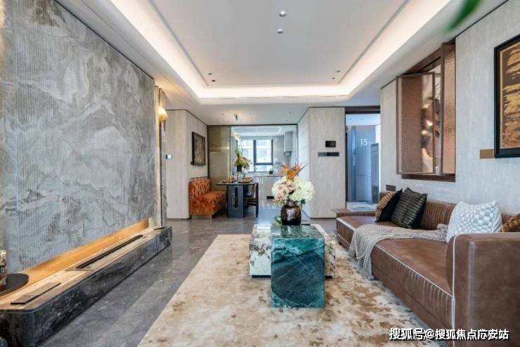 再次,该户型的公区设计尤其出彩,客餐厅厨房一体化设计外接南向大阳台,公区的尺度感做到极致,并且将面积极致利用。