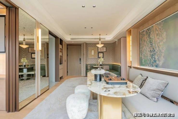 公区设计方面,该户型实际是南北动静分区的设计,南面主次卧休息区域,北面客厅联通餐厨区和水吧台,格局相当方正,避免了面积浪费,也让视野几无遮挡,进门就能感受到大宅气度。