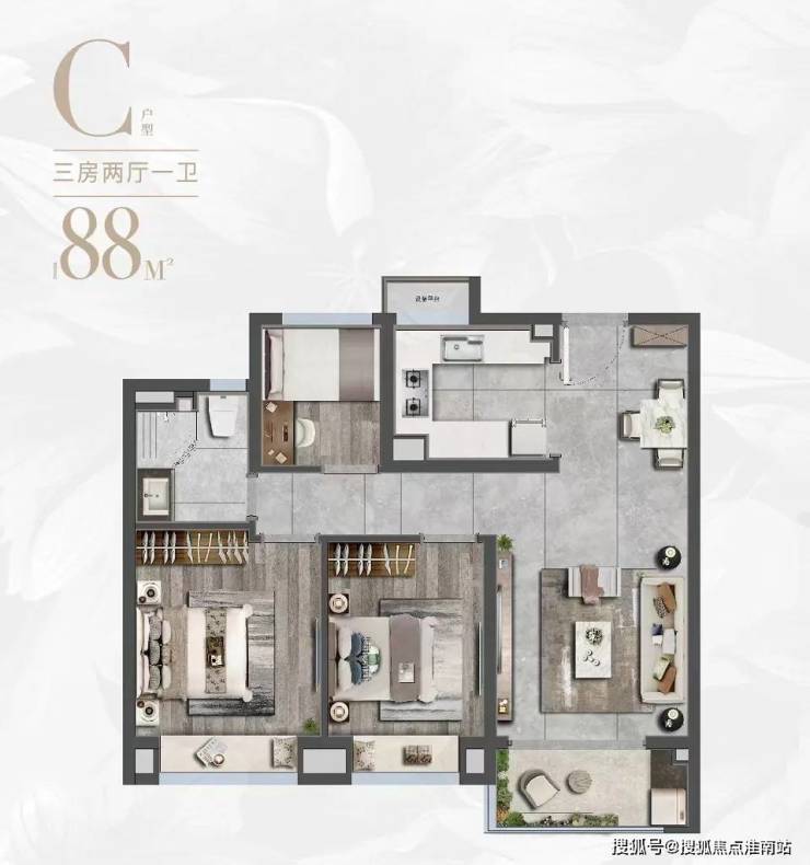 在产品设计上,项目主力户型建筑面积约88-133㎡臻质现房,可以同时满足二胎家庭、三代同堂等多元需求,更以“超悦”臻装标准,兑现业主期许。作为项目备受关注的户型,建筑面积约88㎡户型以“三开间朝南+全明格局”突破传统刚需户型设计理念,三房设计适配从单身到三代同堂的全周期需求,飘窗与观景阳台增强空间延展性,满足年轻小家庭多方面需求。