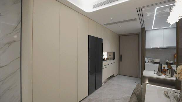 入户玄关设置一整面的玄关柜空间,左侧还额外交付有双开门冰箱、完整的储物空间。