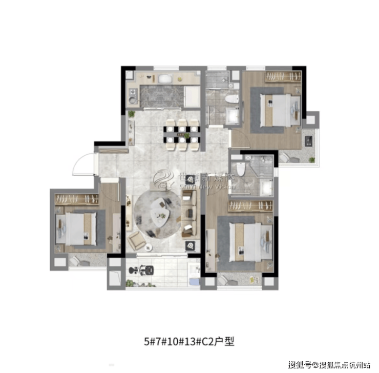 建面约108㎡3房2厅2卫,做到了三开间朝南+双阳台设计+主卧套房设计+南北通透,该户型得房率非常高。