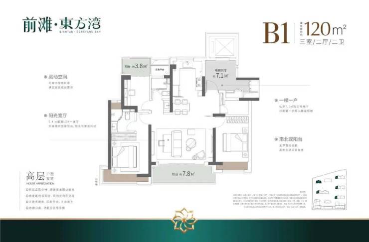其次,独立电梯厅是项目标配,仅建面约103㎡户型2梯2户,其余户型全部1梯1户,全系带(类)独立电梯厅,这妥妥的就是豪宅的配置!