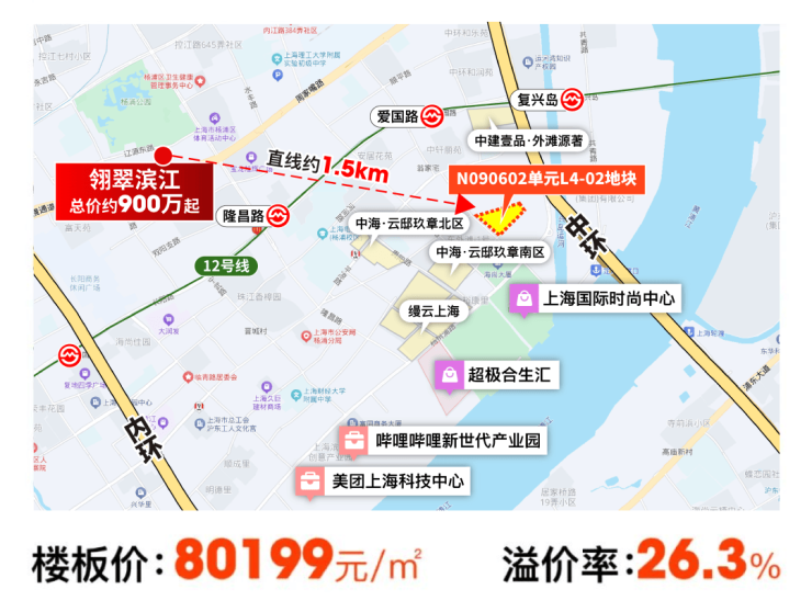 杨浦区N090602单元L4-02地块, 5家经过了72轮的报价,最终以溢价率约26.30%、楼面价约80199.3元/㎡的成绩被拍下。