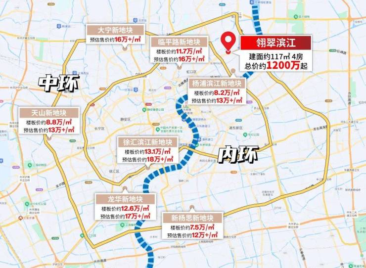 中心城区的土拍价格直线上升,虹口临平路地块的拍出楼板价约11.7万/㎡、徐汇滨江两幅地块楼板价约12.6-13.1万/㎡...