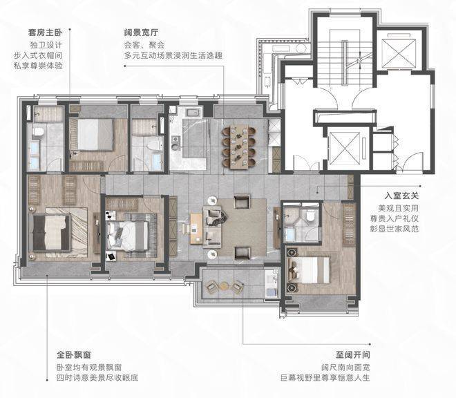建面约155㎡奢悦四房,以双套间主卧设计,精准回应这一需求:私享主卧套间,形成互不干扰的生活圈,既能保留年轻人的社交主场,又为长辈打造专属天地,精准匹配新中产家庭的代际居住需求。南向社交宽厅,承载家庭聚会、朋友宴请、甚至孩子的生日派对,让每一份生活仪式感都有处安放。