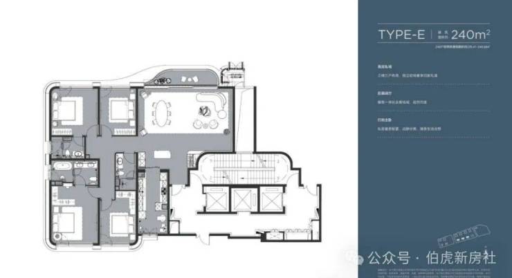 约240㎡江景四房约8.6米超宽横厅进门即见江景;约55㎡LDK一体化空间,餐厅、客厅与西厨岛台形成“社交主轴”,开阔奢朗;南北双套房配置,约30㎡南向主卧套房,集独立衣帽间、SPA卫浴、约4.3米开间睡眠区为一体,北套房4.3 米面宽搭配江景视野,即便在上海400㎡以上豪宅中也属罕见。