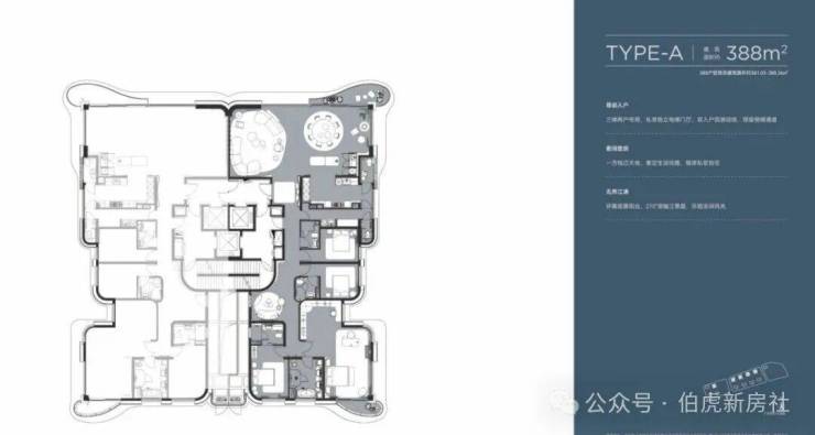约388㎡一线江景大平层作为“藏品级”户型,约13米的惊人面宽冠绝上海,一些450㎡以上大户型,亦无如此阔绰尺度。客餐厅实际面积接近约100㎡,约3.5米轩朗层高,领先第四代住宅“国标”。南北双270°弧形转角环幕阳台,北望江景,南拥园景。3梯2户设计,双入户洄游动线,保姆动线与主人动线分离,顶豪该有的尊崇感被诠释得淋漓尽致。