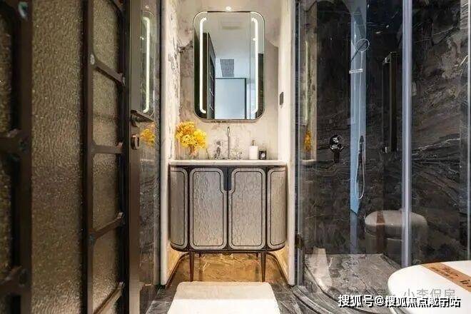 电视背景墙选用意大利超白洞石材;卫生间台面及墙面采用芬迪白;来自巴西进口的静雅棕石材在有些顶豪中仅用于卫生间点缀,而在绿城黄浦ONE,则将其大量运用于地面铺装