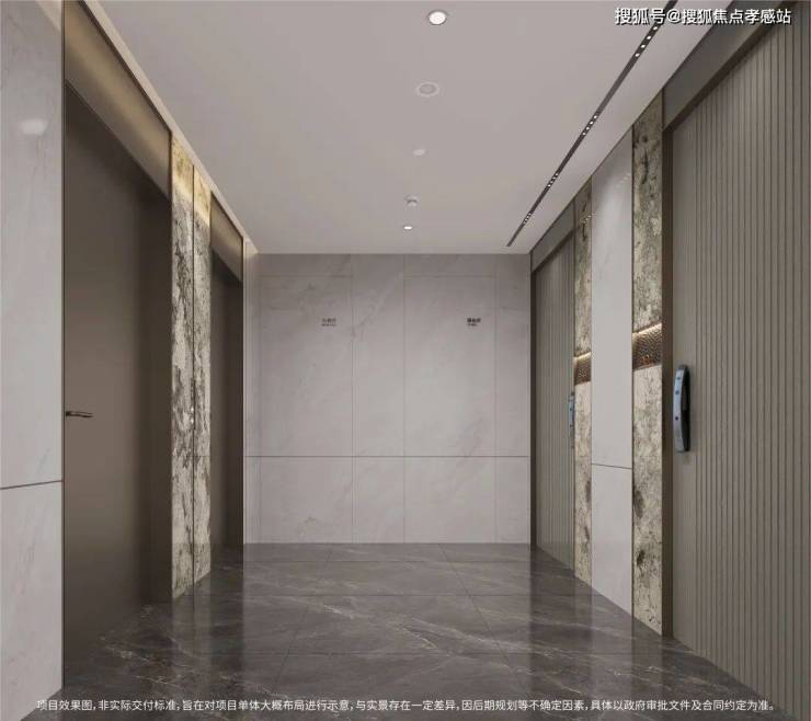 高定地下入户大堂,延续首层入户大堂材质高标,精选雪山银狐天然透光奢石,营造精奢生活质感。
