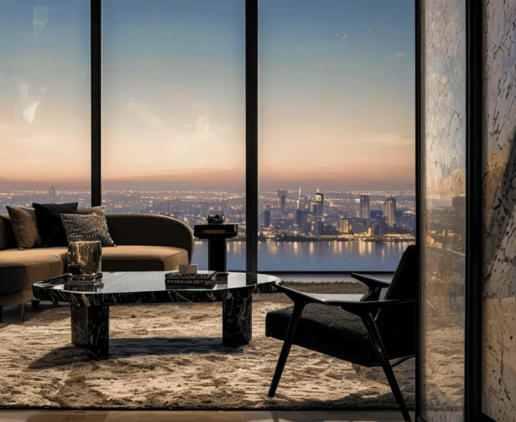 整体约10米的南向面宽,搭配约270°转角全景主卧,将黄浦江和复兴岛延展为私人景观轴。清晨睁眼就是江面轻雾铺开的柔光,夜晚拉开窗帘则是城市灯火倒映水波的静谧。