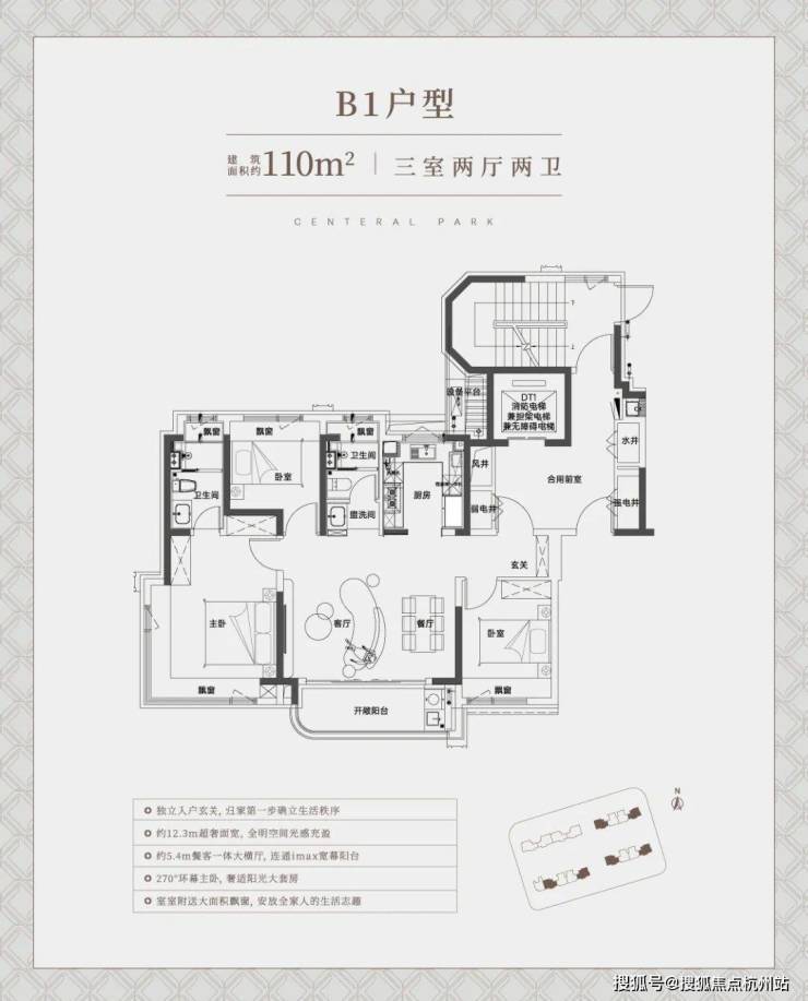 先来看建面约110㎡边套大横厅户型:约12.3米的超宽绰面宽几乎是堪比别墅产品了,这个视野和 南向采光面相当出众。
