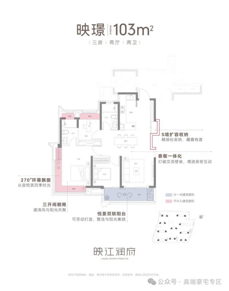 惊艳亮点一:映江润府建面约103㎡边套户型,引入了千万级以上豪宅之中才能够拥有的270°环幕飘窗设计,实现了极致的采光和观景体验。