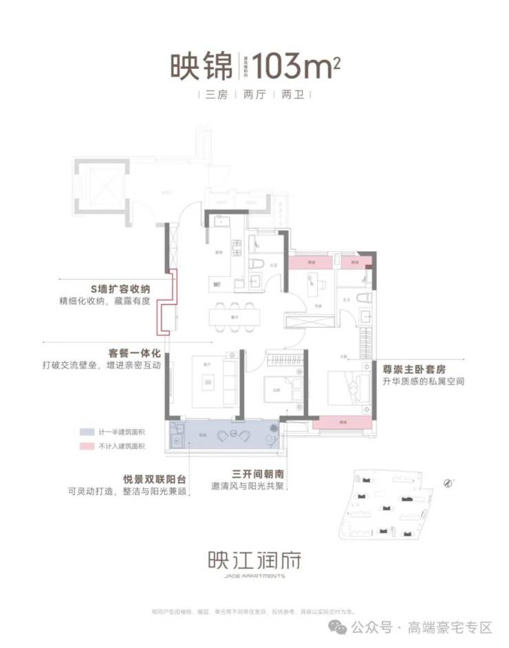 项目建面约103㎡中间套几乎保留了上述户型所有惊艳亮点,包括客餐一体化、双联阳台+多飘窗附赠、三开间朝南、套房主卧等。