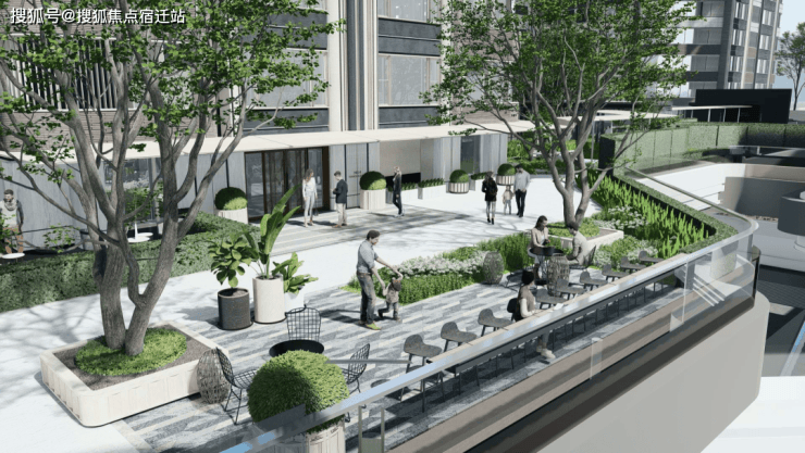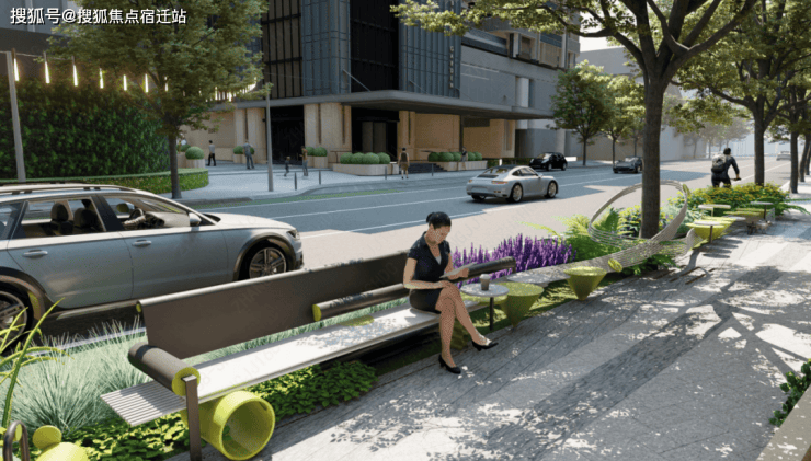 项目在街边的转角、街区的外廊,均打造 城市花园长廊, 超级绿核枢纽45度角贯穿街