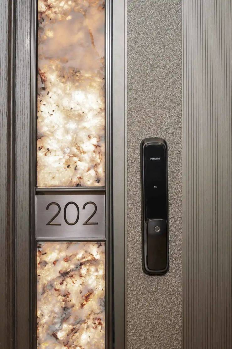 入户门一侧以奢石背景板,内嵌灯带,后期门牌号也会内置灯带,让入户门前更加明亮美观,增强归家的幸福感。