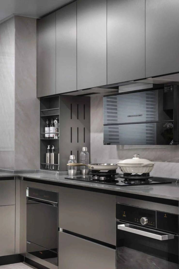 客餐厅厨一体化,U型厨房设计。标配厨房七件套,包括:洗碗机+侧吸油烟机+燃气灶+蒸烤一体机、线性凉霸、末端净水、双开门冰箱!连调味品收纳架也是交付的,完全可以实现拎包入住!