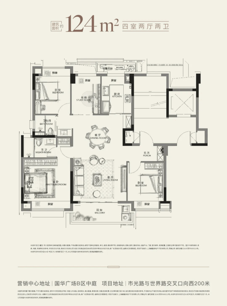 建面约124㎡的一步到位改善四房