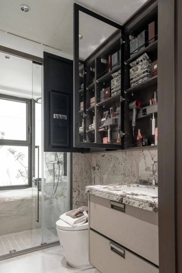 小户型最让人担心的小户型的收纳问题招商序给出了自己的解题思路,让我们看看它的收纳空间,首先是一整排的玄关收纳,玄关柜据说可以放下28双高筒靴,而且是大理石的台面石,另一侧的储物柜是一个容量较大的落地柜,足够收纳一个大行李箱,背面还贴心设置了洞洞板,可以悬挂雨伞、包包等物品,整个玄关柜是天然木皮鸡翅木包裹,非常高级,预留S墙的设计轻松收置双开门冰箱、厨房与卫生间采用了模块化的收纳系统,通过碗碟拉篮、谷物抽、不锈钢开架,贯穿式镜柜与美妆冰箱等收纳道具,将日常用品归置的仅仅有条,114主卧更是预留了超大的衣柜空间。