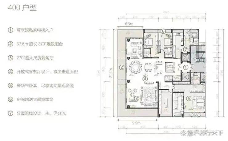 以 310㎡主力户型为例,首层设有长辈套房及开放式会客厅,方便长辈居住与日常接待宾客;二层规划为儿童活动区,充分考虑孩子的成长需求;三层为主卧总统套房,给予主人尊贵私密的生活空间。地下两层空间开阔,挑高约 5 米,业主可根据自身喜好改造成酒窖、影音室、私人会所或健身房等。每户均附赠 50 - 100㎡的南北双花园,无论是种花养草,还是举办户外派对都十分适宜。同时,还配备 200 - 500㎡的地下室及双车位,大大提升了居住的实用性与便利性,实际使用面积可达 450 - 950㎡,得房率超 95% 。