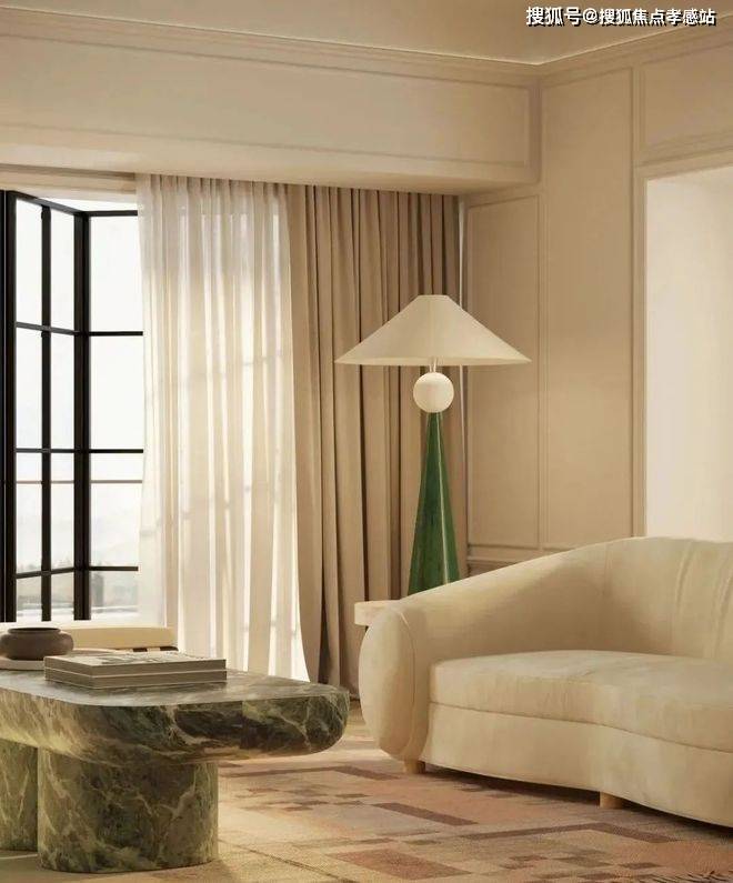 空间中每个物件都经过精心挑选:鱼骨拼木地板沉淀时光质感,格纹地毯与抹茶色大理石茶几搭配,营造出优雅而不失温度的氛围。