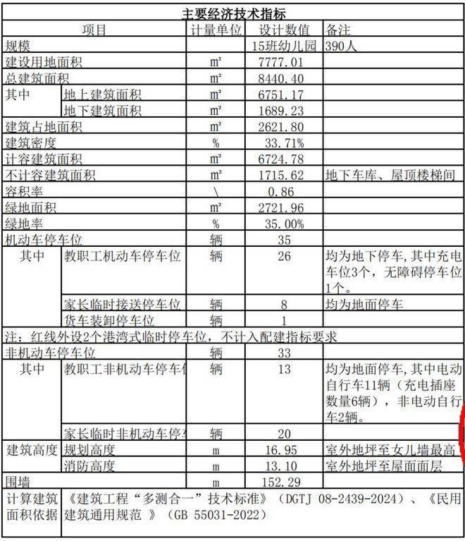 项目将新建1栋单体建筑,总建筑面积8440.40㎡,其中地上6751.17㎡、地下1689.23㎡,容积率0.86,建筑高度16.95m。项目规划为15班幼儿园,可容纳390人就读,绿地面积2721.96㎡,绿地率35.00%。